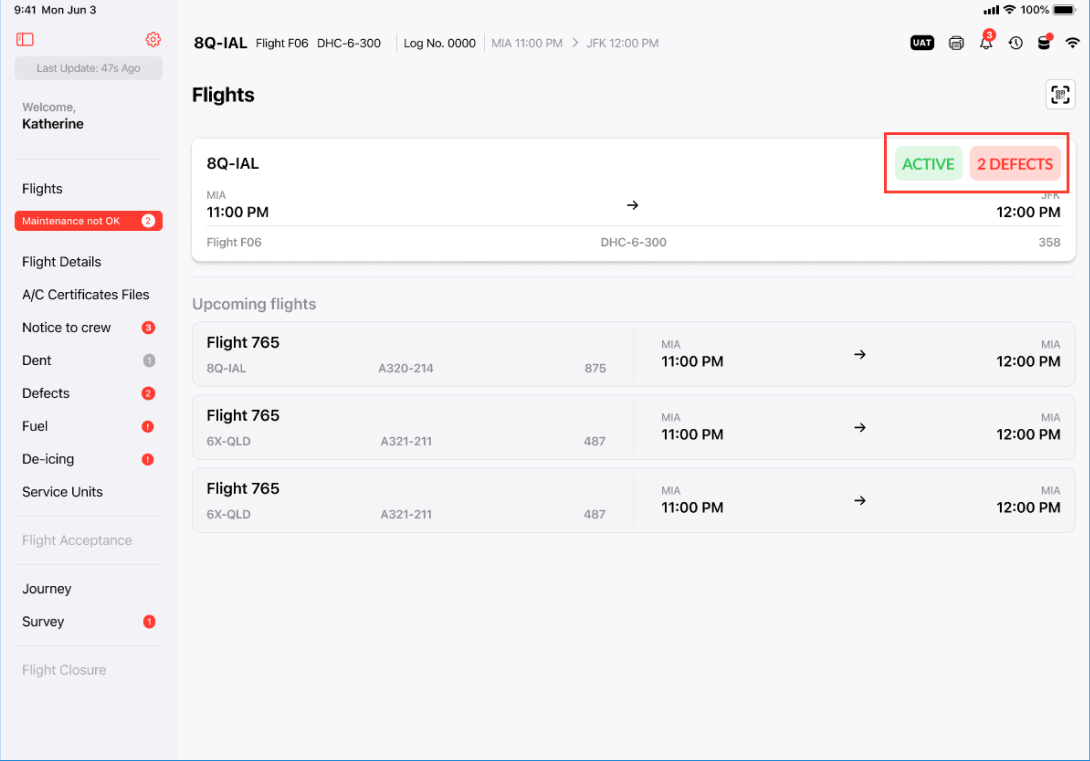 Based on the discussion the stakehodlers request to change the "ACTIVE STATUS" location and remove the "DEFECT Button" form the current Flight card. We opted to move it on top of the Flight card for quick visability.