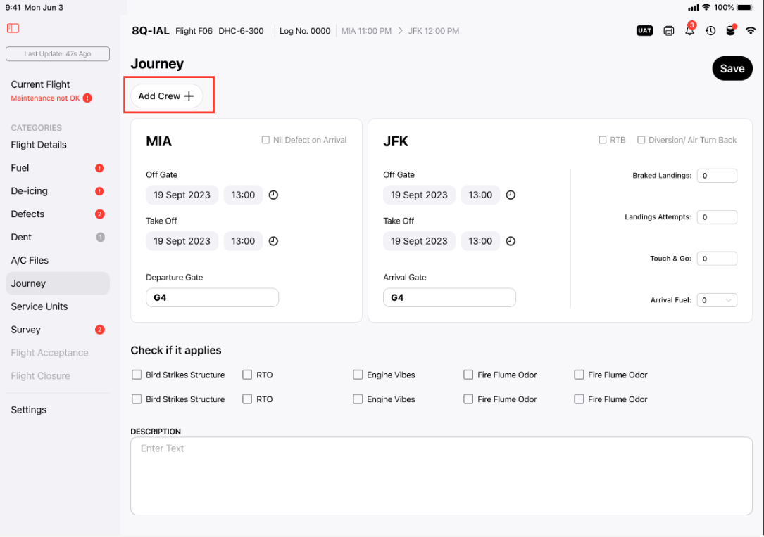 Clean, minimalistic design with clear navigation and labels. Automatically populate basic flight details (e.g., flight number, tail number) to save time. Ability to save reports offline and sync later in case of connectivity issues. Responsive design for tablets and small screens.
